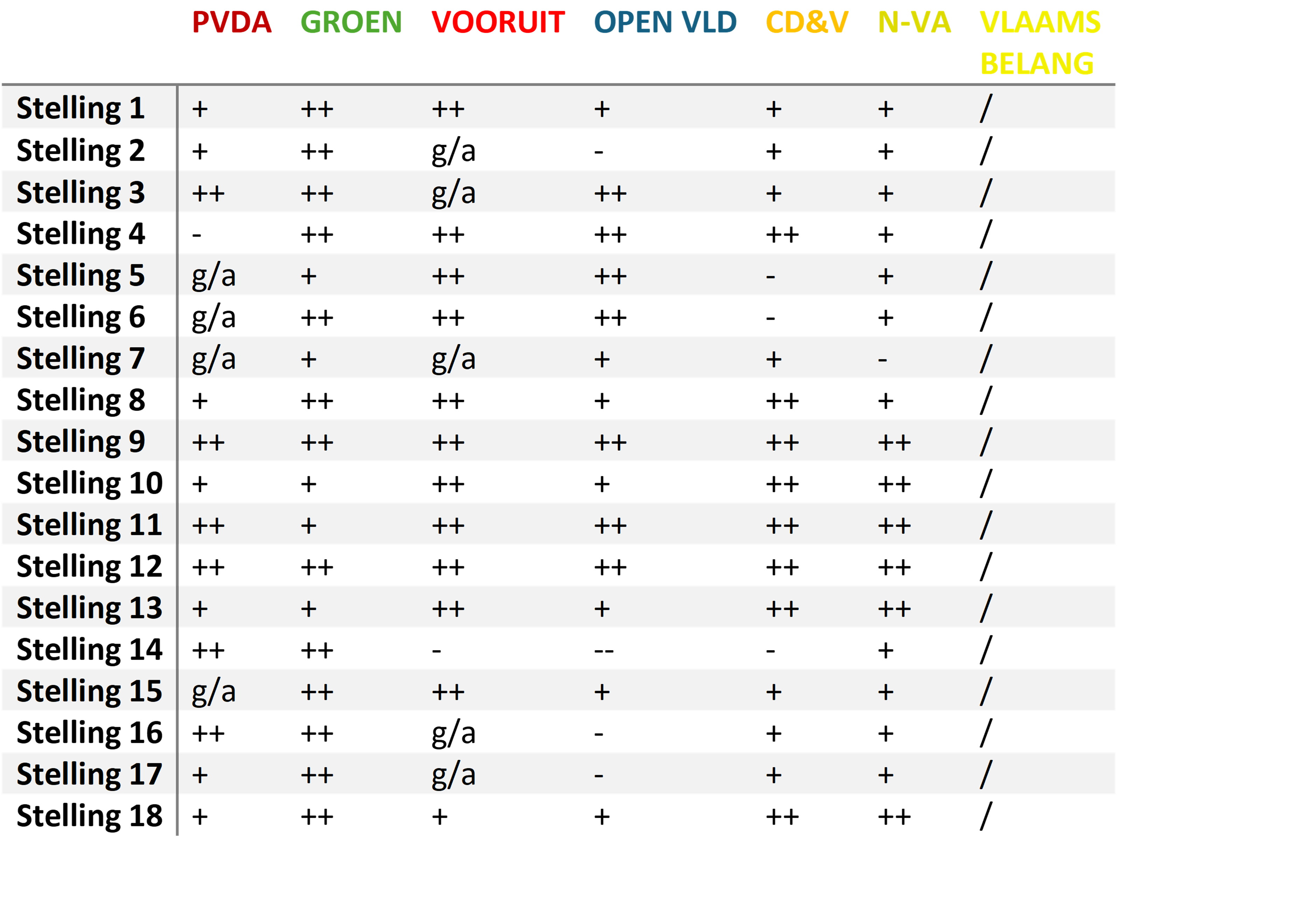 De bovenstaande tabel geeft kort weer in welke mate de partijen akkoord gaan met de stellingen van çavaria (++ zeer eens; + eens; - oneens; -- zeer oneens; g/a geen antwoord; / niet bevraagd). Hieronder overlopen we per thema in hoeverre de partijen akkoord gaan met de stellingen en welke standpunten zij innemen. Vlaams Belang werd niet bevraagd geweest door çavaria. De partij staat kritisch tegenover maatregelen die het welzijn van LGBTQ+ personen kunnen vergroten. Ze willen geen (positieve) discriminatie of overheidssubsidies voor besturen, verenigingen of bedrijven die zich hieraan ‘schuldig’ maken. Ook willen ze een onderzoek naar de aanwezigheid van de woke-ideologie in het Vlaams onderwijs.