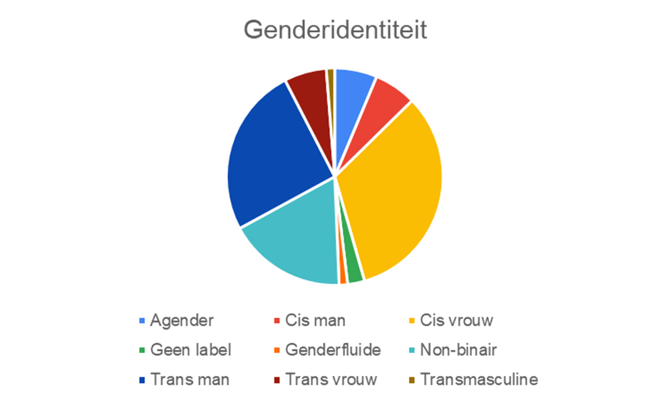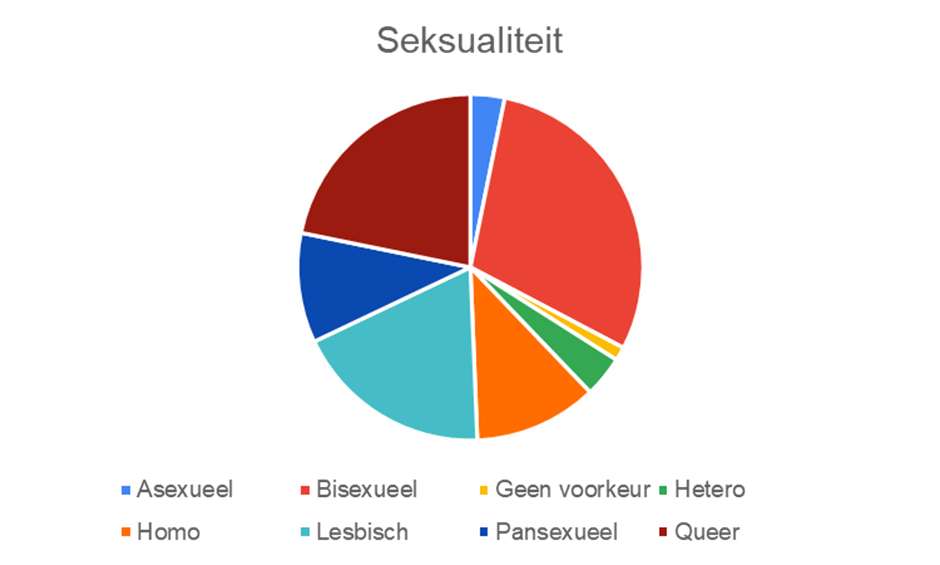 In totaal vulden 79 jongeren onze enquête in, waarvan het grootste deel uit Vlaanderen of Brussel komt (99%). De gemiddelde leeftijd was 21 jaar, waarvan de jongste 14 jaar en de oudste 30 jaar. Voornamelijk cis vrouwen (33%) namen deel, gevolgd door trans mannen (25%) en non-binaire personen (18%). Ook de andere genderidentiteiten werden bereikt, maar in kleinere aantallen. Onder de respondenten bevonden zich ook 6% intersekse personen. Wanneer we peilen naar hun seksualiteit valt het op dat 29% van onze respontenten zich als biseksueel identificeert. Dit is niet verrassend, aangezien biseksuele personen de grootste subgroep is binnen de LGBTQIA+ gemeenschap, maar ook eveneens de meest onzichtbare. Samen met panseksuele personen maken ze 39% van onze respondenten uit die zich aangetrokken voelen tot hun eigen en minimaal 1 andere genderidentiteit. 22% van de mensen die onze bevraging invulden, verkiezen de term ‘queer’, 17% identificeert zich als lesbisch. Homo’s representeren 11% van de respondenten, aseksuelen 4%.