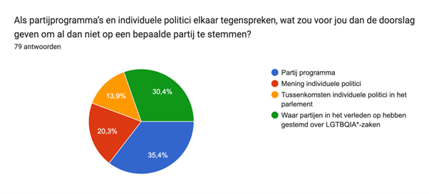 Soms spreken politici zich individueel uit over bepaalde issues, al dan niet tegen hun eigen partijprogramma’s. Ook stemmen partijen toch niet helemaal zoals ze eerder beloofden (woops!). Daarom vroegen we de jongeren waar ze het meeste belang aan hechten als ze hun stemkeuze maken: partijprogramma's, individuele politici, tussenkomsten van politici in het parlement of eerder stemgedrag van partijen over LGBTQIA+ thema's.
